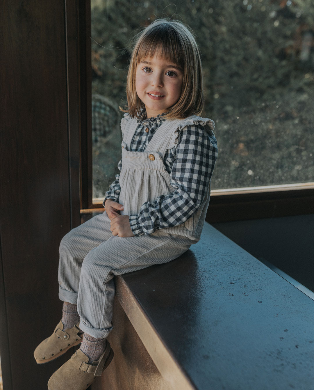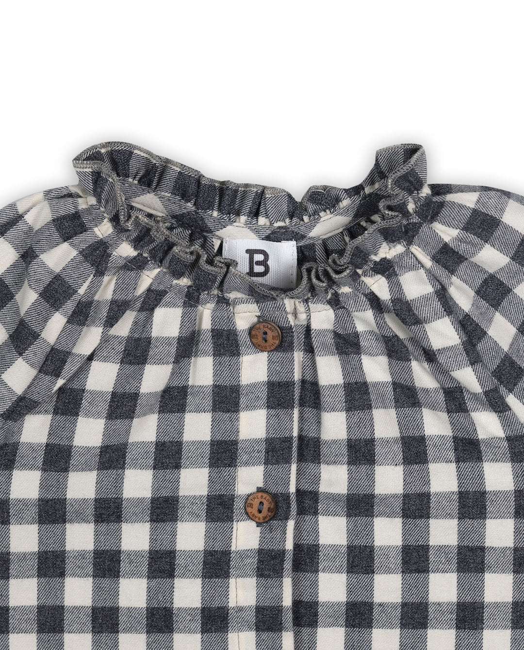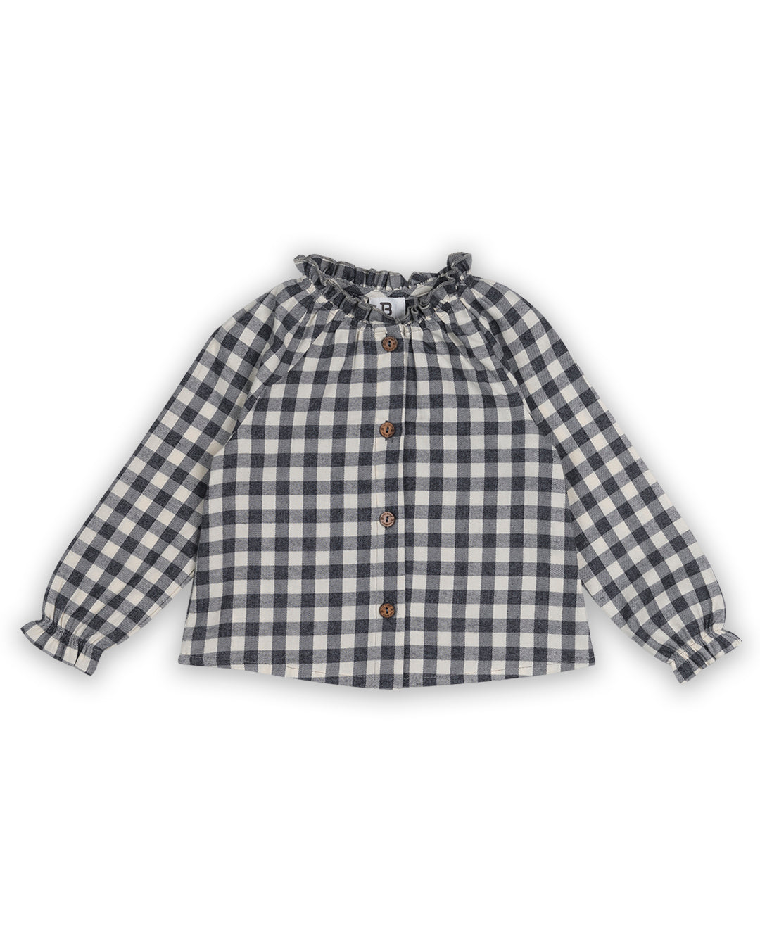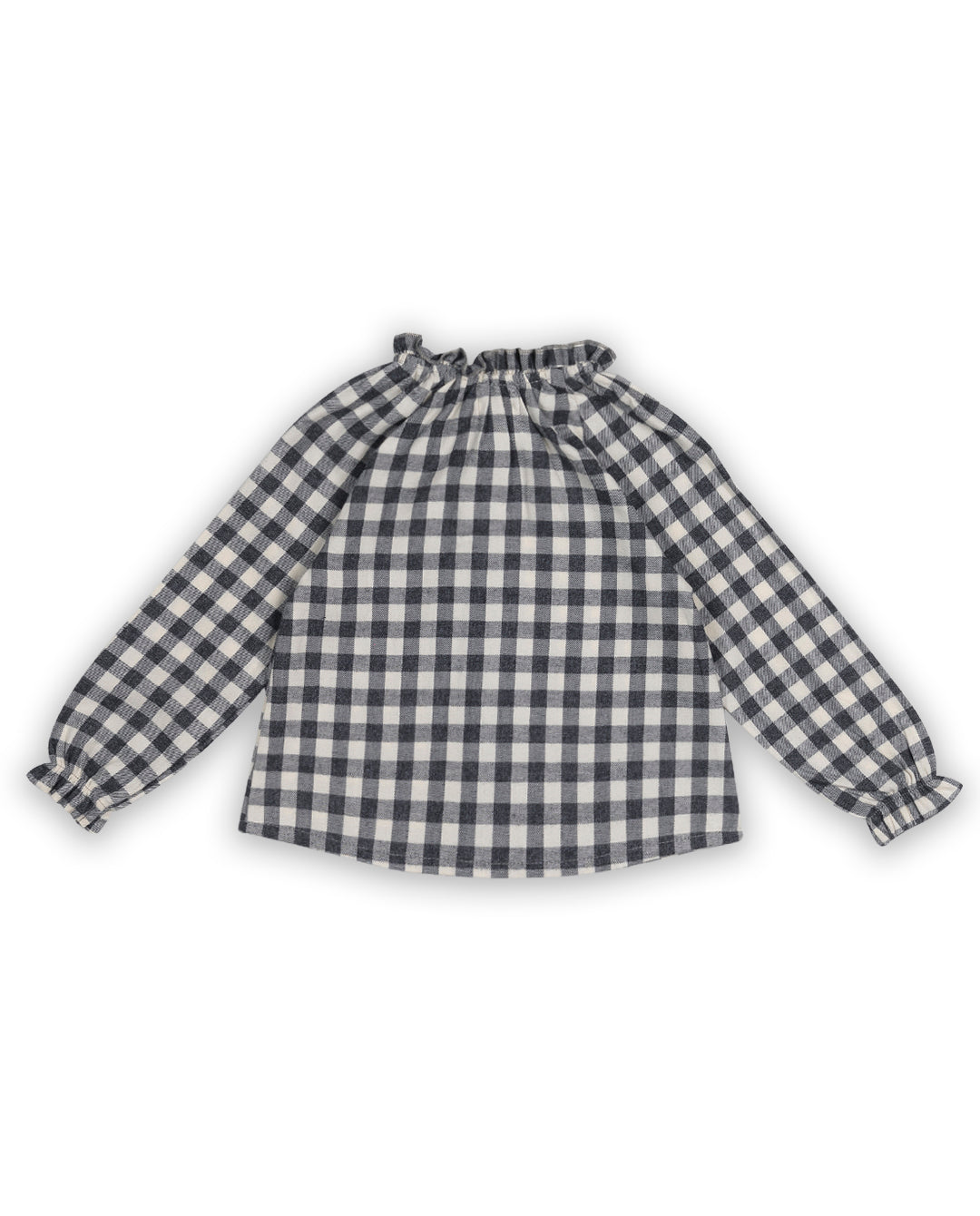 Blusa de algodón orgánico con forma acampanada, cuello y mangas fruncidos. Se cierra en el frente con botones de madera.
