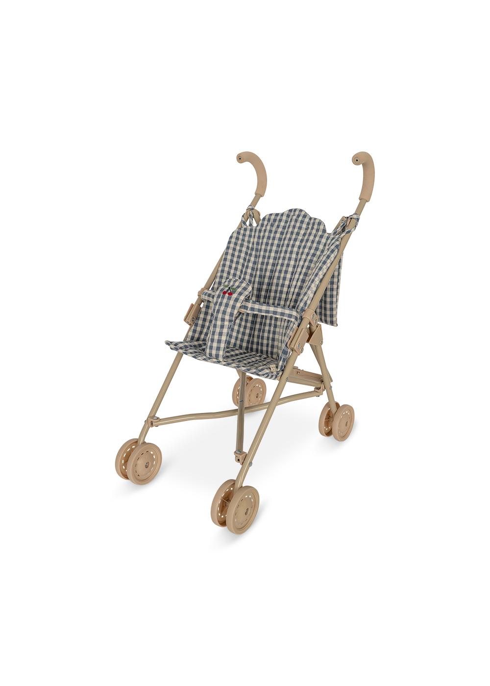 Cochecito de muñeca diseñado con un arnés, una bolsa de transporte y ruedas dobles en las cuatro patas para mayor estabilidad.