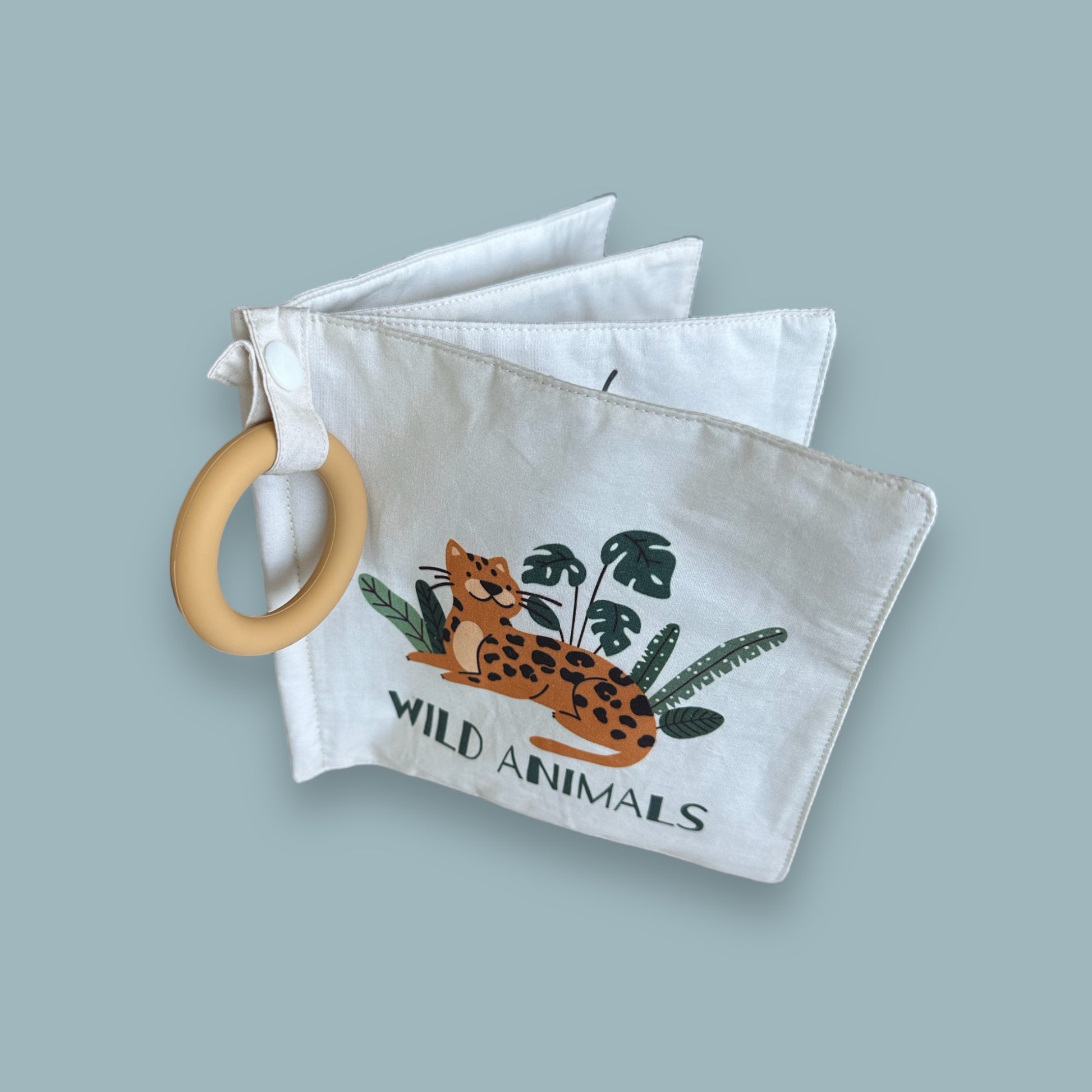 Educational crinkle book for babies and toddlers. Textures, sounds, flaps, and silicone teething ring.