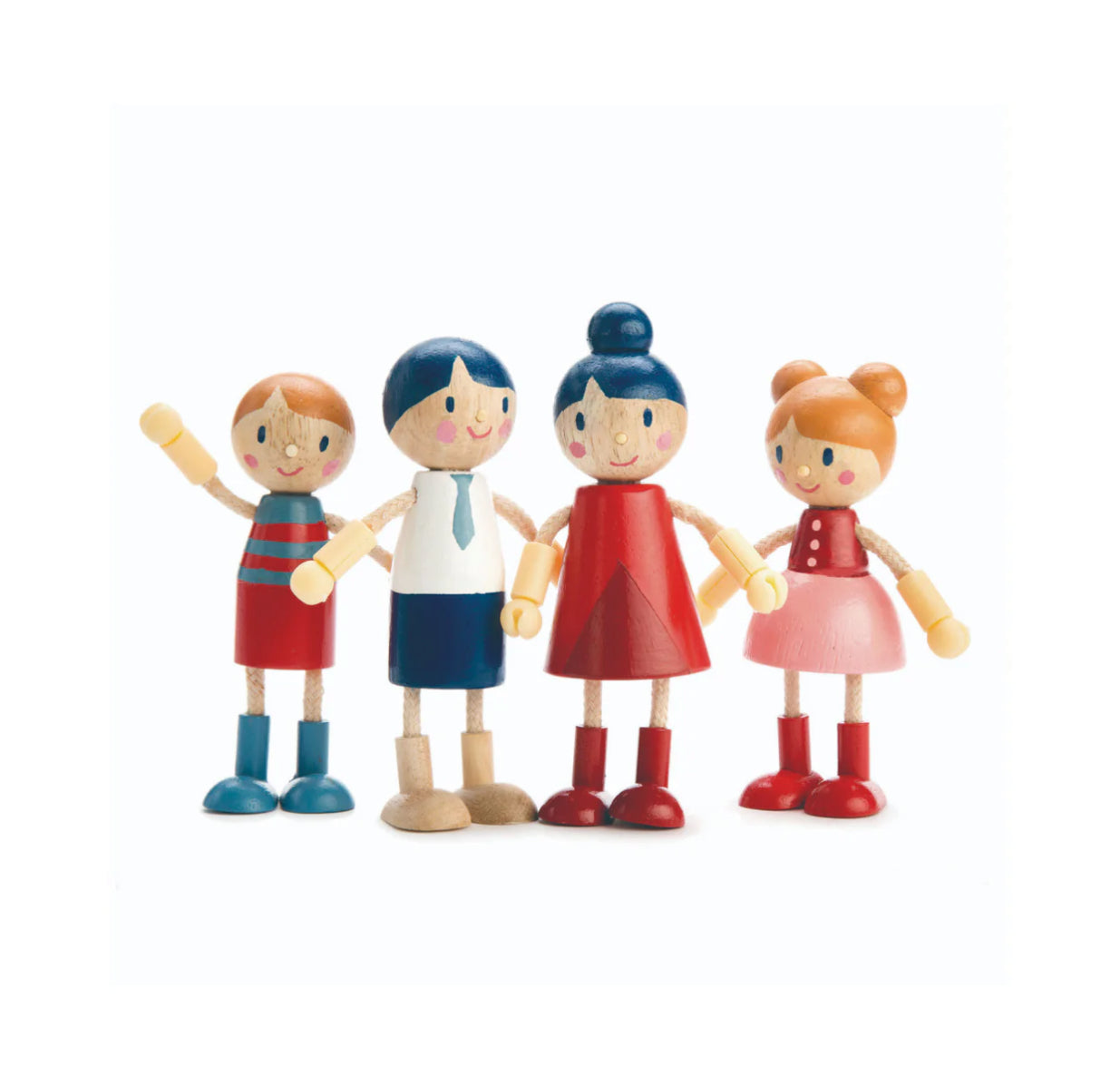 Una encantadora familia de madera natural con brazos y piernas flexibles para que puedas hacer cualquier pose que desees. El set incluye: mamá, papá, una niña y un niño para inspirar el juego imaginativo. Fabricados a escala para nuestras casas de muñecas. Se pueden jugar solos o pueden ser los complementos perfectos para nuestra gama de casas de muñecas.