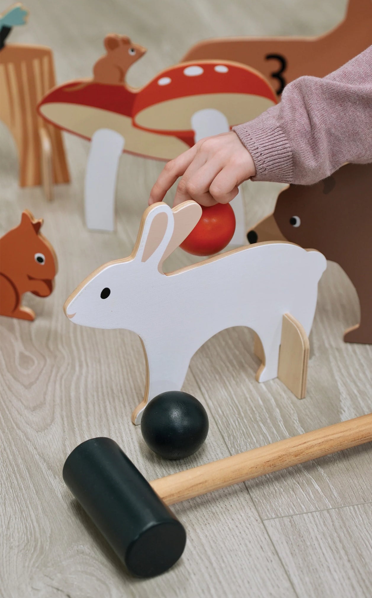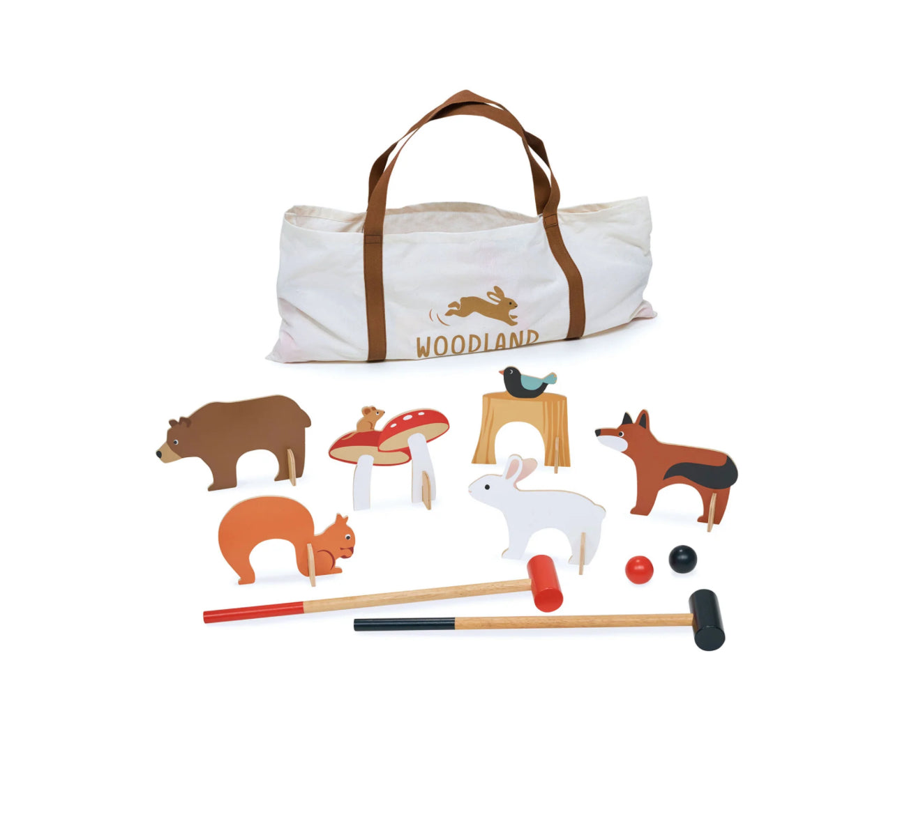 Contenido en una práctica bolsa de tela con asa para el hombro, encontrarás 6 aros de croquet con temática de bosque ilustrados en colores llamativos, 2 mazos de croquet de madera y 2 bolas de madera pintadas. Una ardilla, un conejo, un oso, un zorro, un tronco de árbol con un pájaro, un hongo con un ratón, todos pueden ser arreglados para recrear un prado en el bosque. Perfecto para 2 jugadores, apunta la bola a través de los aros y utiliza el número en la parte posterior de cada pieza para sumar tus puntos.