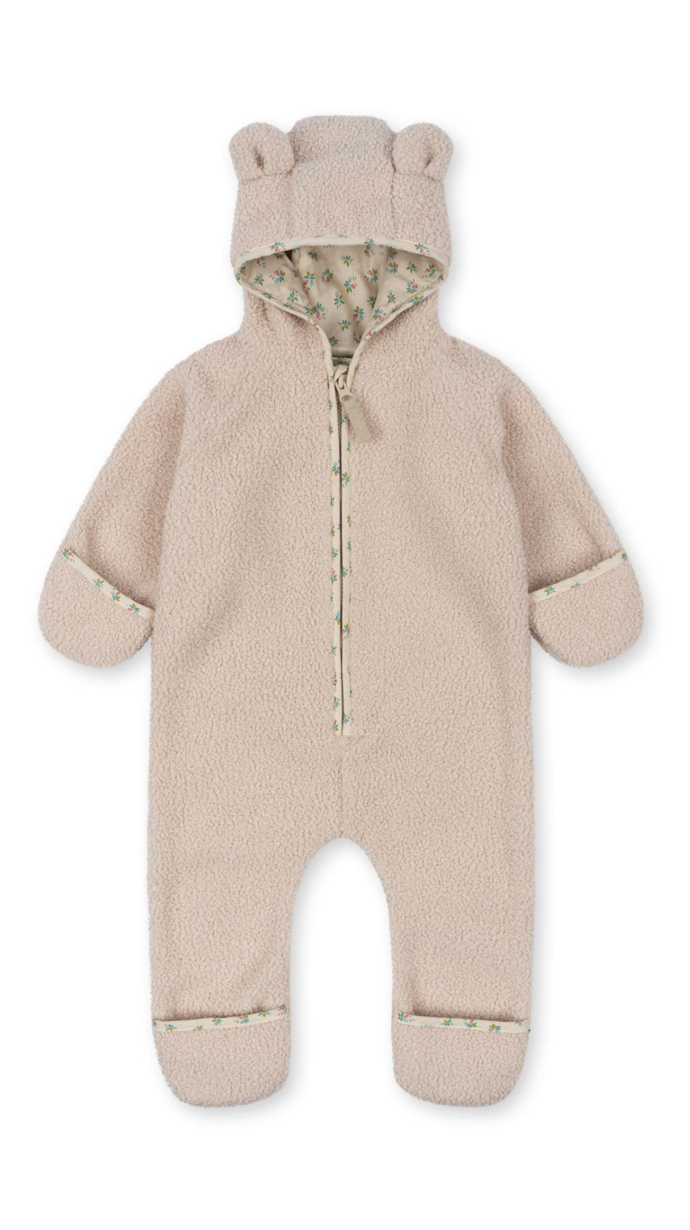Monos hecho de cómodo poliéster de teddy con un suave forro de felpa y ribetes de algodón orgánico. Cuenta con puños plegables para mantener las manos de tu bebé calientes.