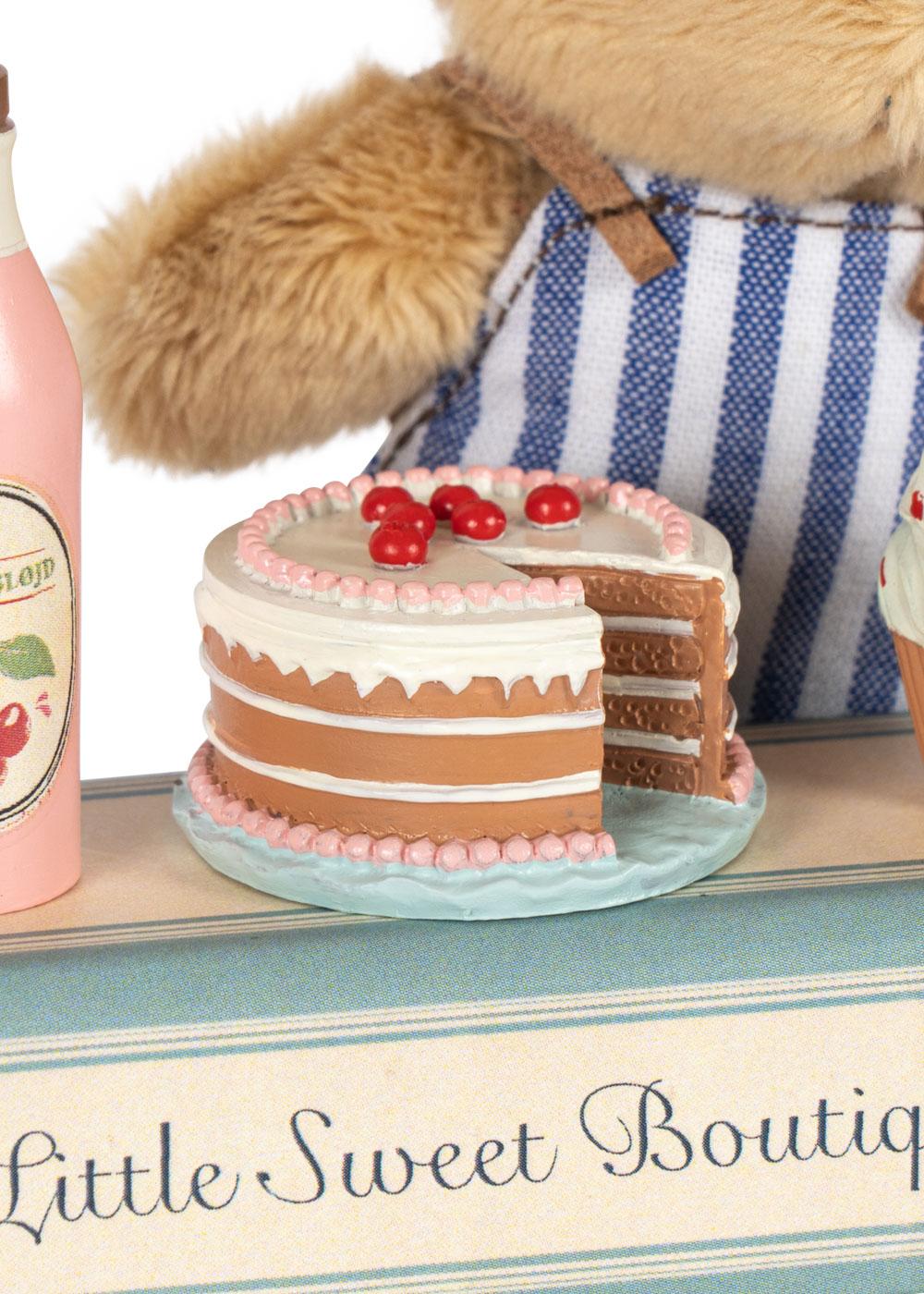 ¡Una tiendita adorable hecha a la medida del universo miniatura de nuestros ositos! Incluye todo lo necesario para jugar a la dulcería: 3 pastelitos, una botellita y un osito con su mini delantal listo para atender.