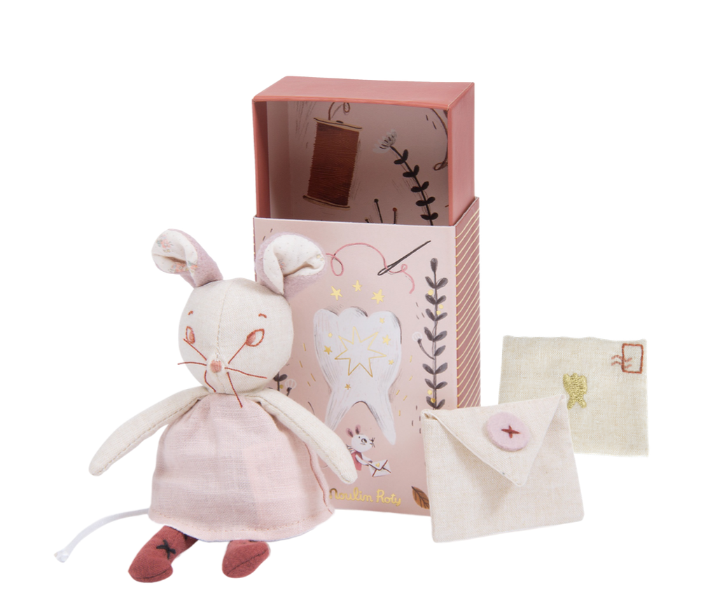 ¡La pequeña hada sostiene en su mano un sobre de velcro con un interior de flores, para guardar los dientes de leche de los niños! Lleva un vestido de lino con alas en la espalda, su rostro está bordado y sus orejas son de suave terciopelo.