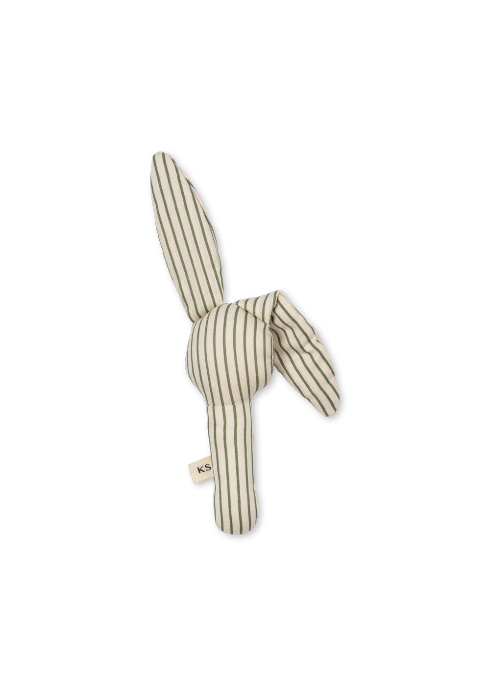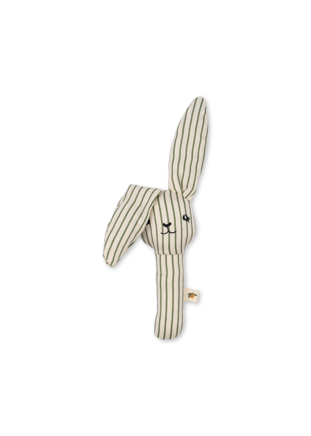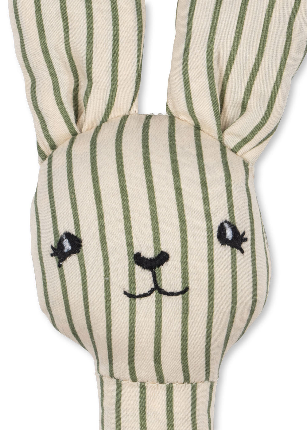 Sonajero de mano de un conejito y una campanita en su interior para hacer sonido.