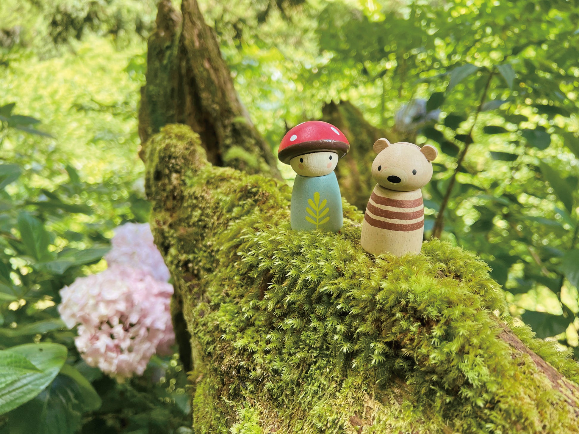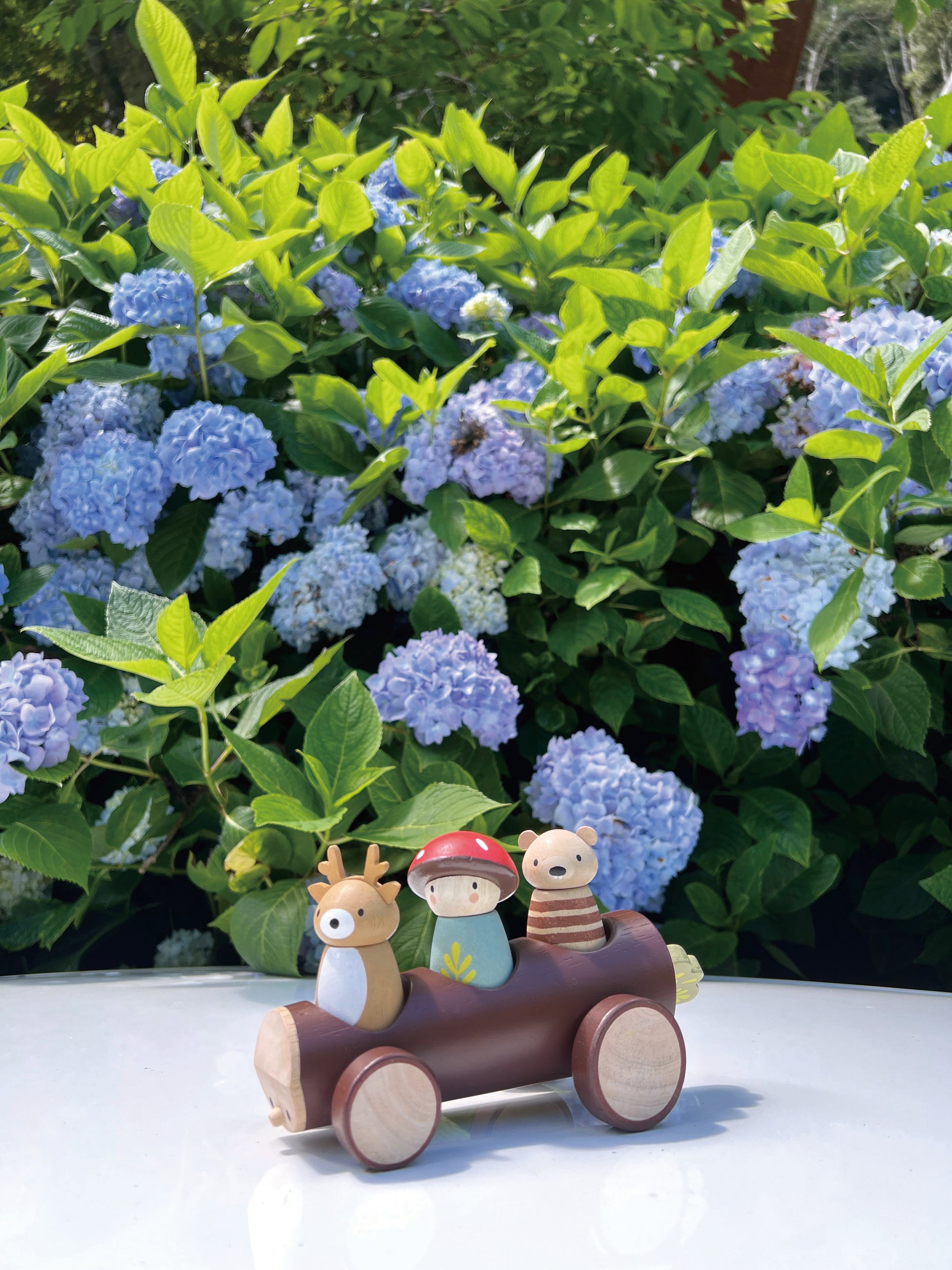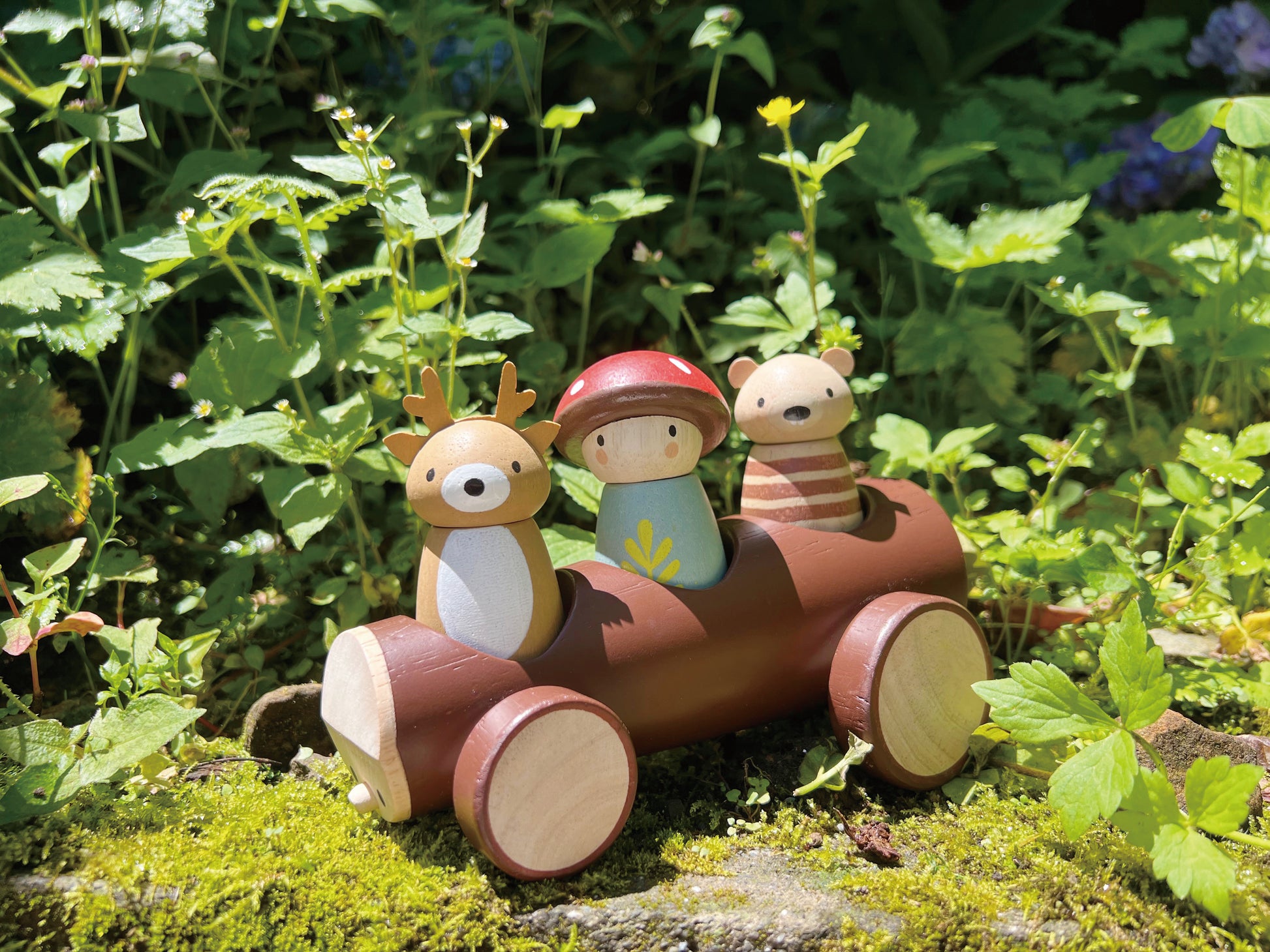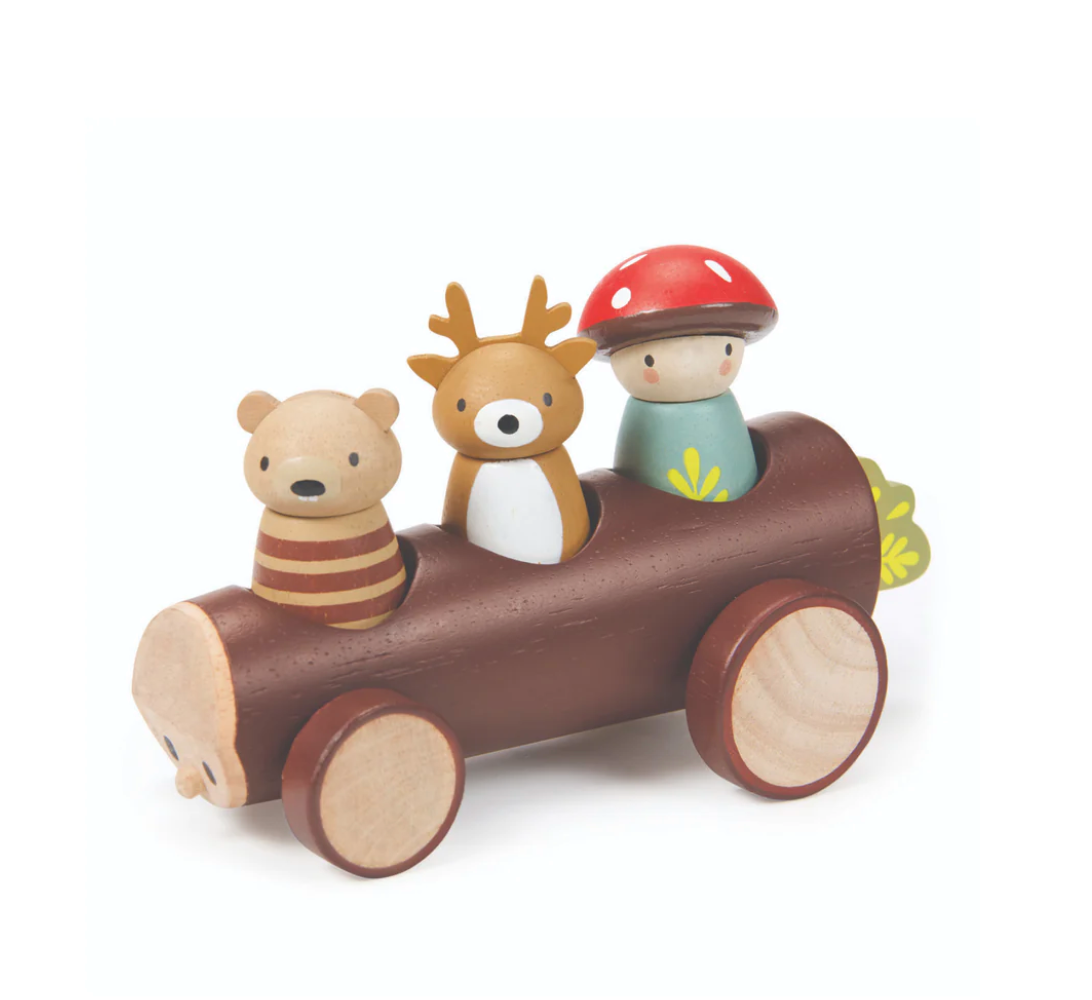 Nuestro peculiar vehículo en forma de tronco es ideal para el juego imaginativo. Fungi el honguito, Robbie el venado y Woody el osito, irán en búsqueda de una aventura mientras recorren y exploran los caminos del bosque.