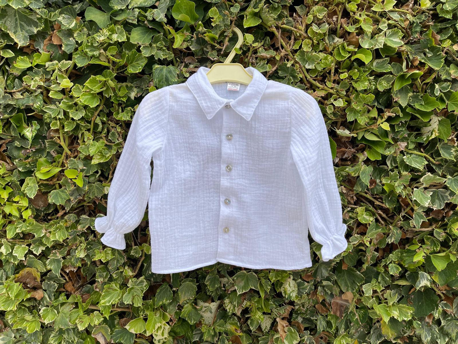 Camisa blanca de muselina con cuello y botones de perla.